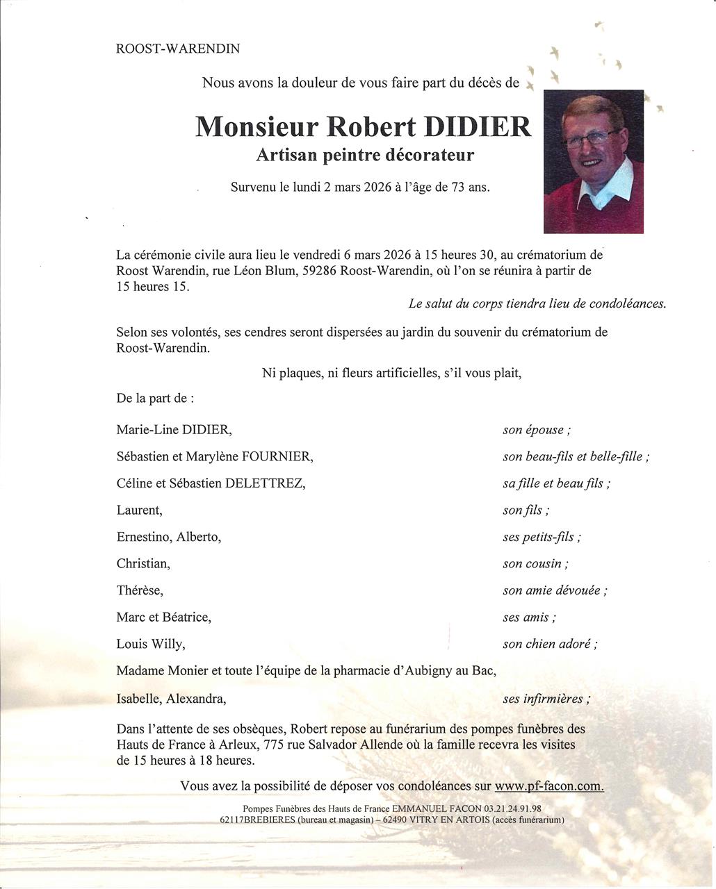 Décédé à Dechy (59187, France) le lundi 2 mars 2026 à l'âge de 73 ans
