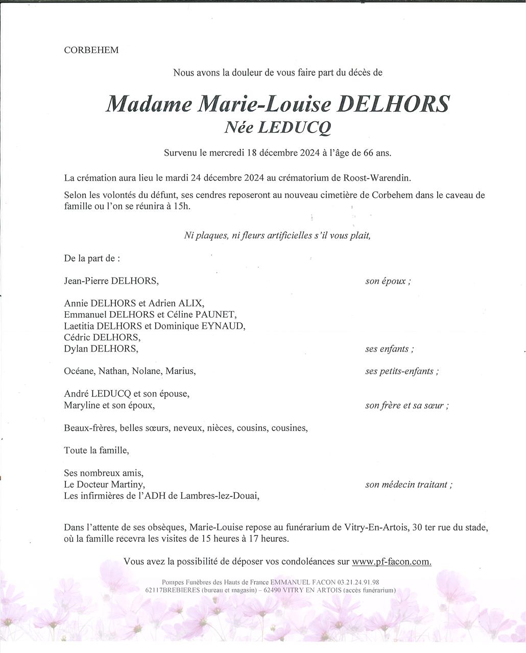 Décédée à Corbehem (62112, France) le mercredi 18 décembre 2024 à l'âge de 66 ans