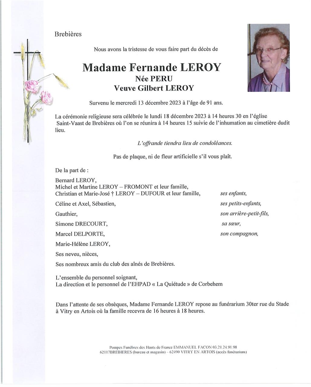 Décédée à Corbehem (62112, France) le mercredi 13 décembre 2023 à l'âge de 91 ans