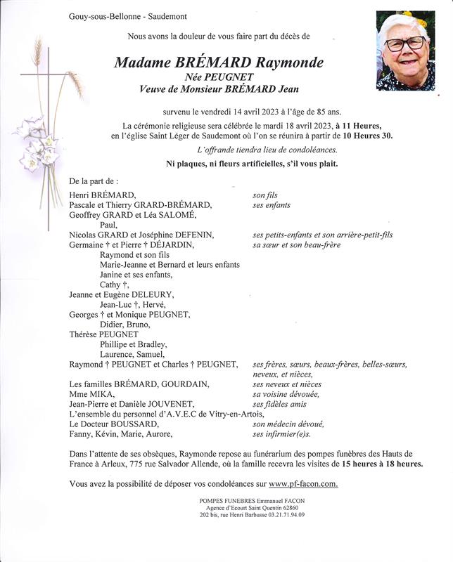 Madame RAYMONDE BRÉMARD née PEUGNET
