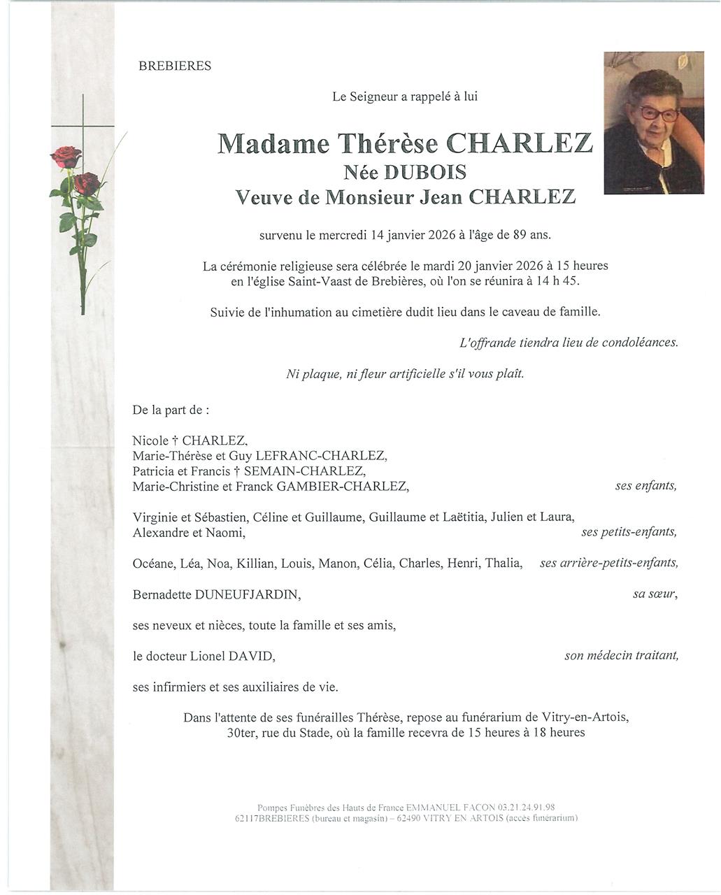 Veuve de Monsieur Jean, Henri, François CHARLEZ