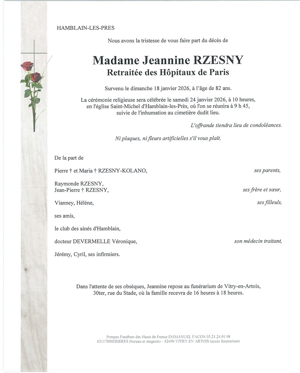 Décédée à Arras (62000, France) le dimanche 18 janvier 2026 à l'âge de 82 ans