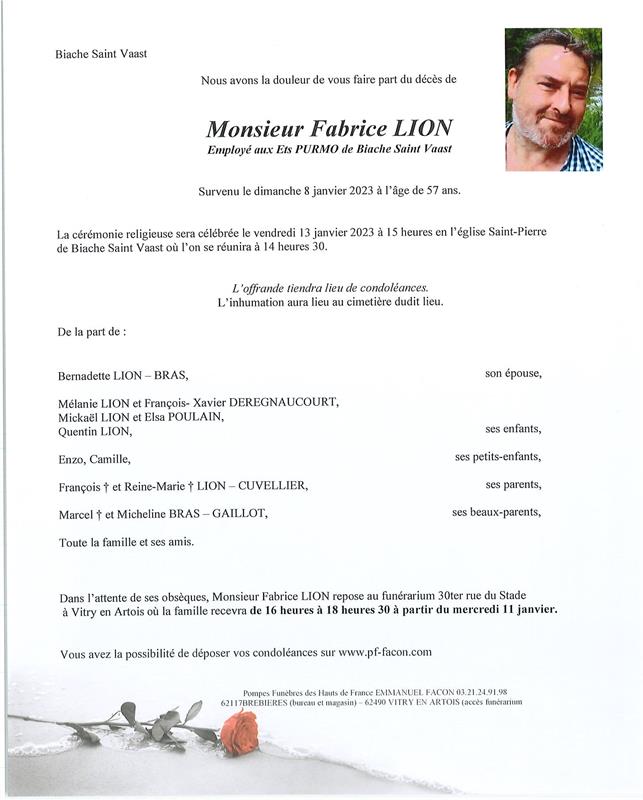 Décédé à Arras (62000, France) le dimanche 8 janvier 2023 à l'âge de 57 ans