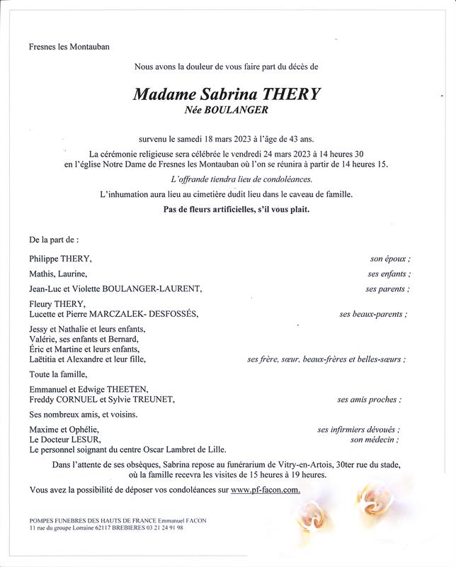 Décédée à Fresnes-lès-Montauban (62490, France) le samedi 18 mars 2023 à l'âge de 43 ans