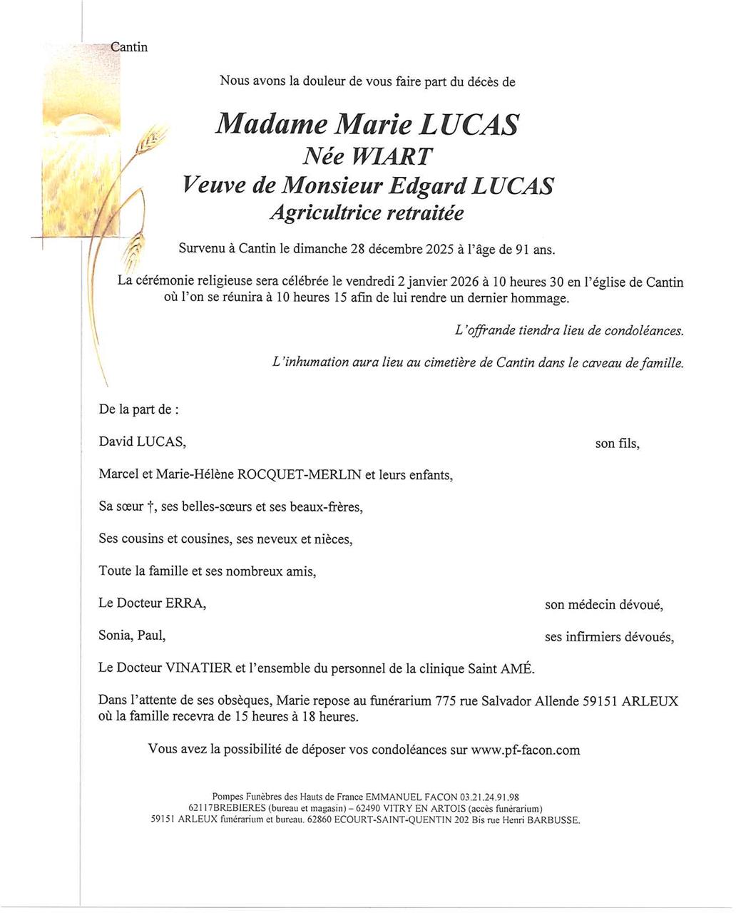 Décédée à Cantin (59169, France) le dimanche 28 décembre 2025 à l'âge de 91 ans