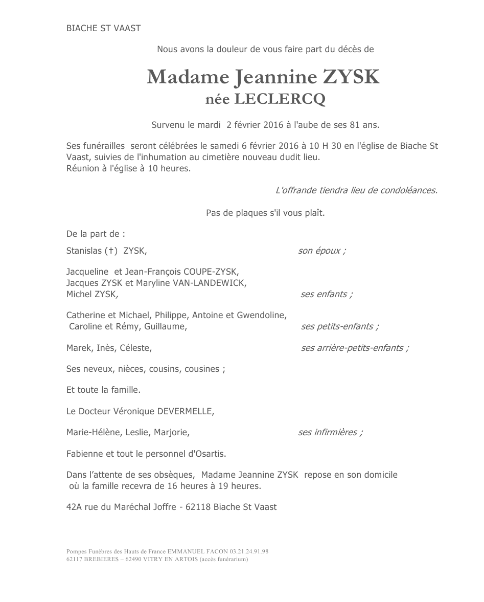Madame Jeannine ZYSK née LECLERCQ